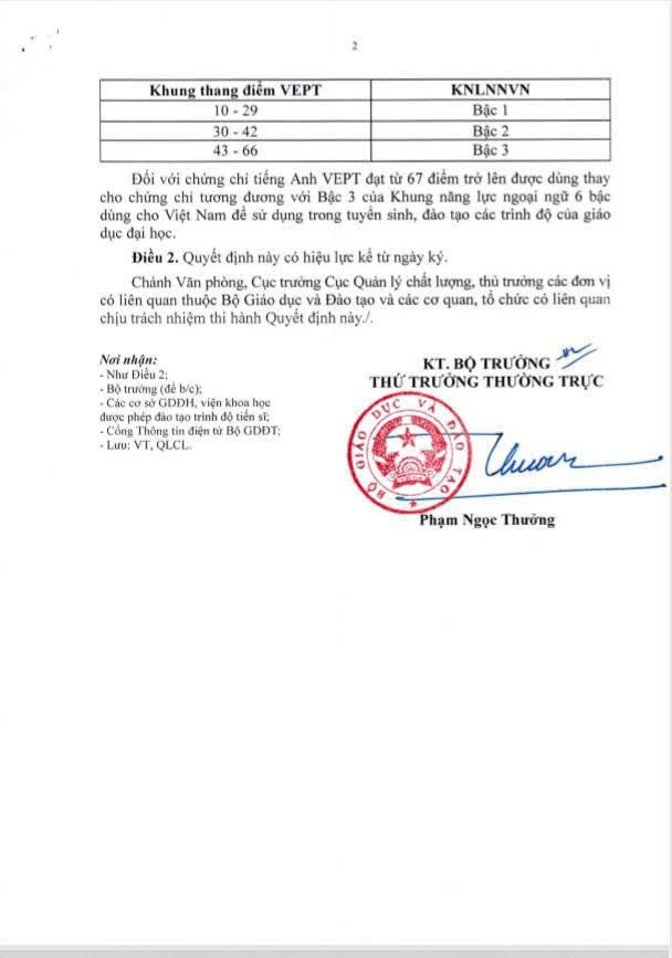 📌 Quyết định có hiệu lực kể từ ngày ký, tạo điều kiện thuận lợi, linh hoạt và chuẩn hóa cho người học trong việc sử dụng chứng chỉ tiếng Anh được công nhận.