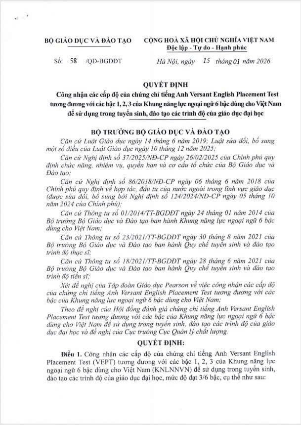 Căn cứ Quyết định số 58/QĐ-BGDĐT ngày 15/01/2026 của Bộ Giáo dục và Đào tạo,