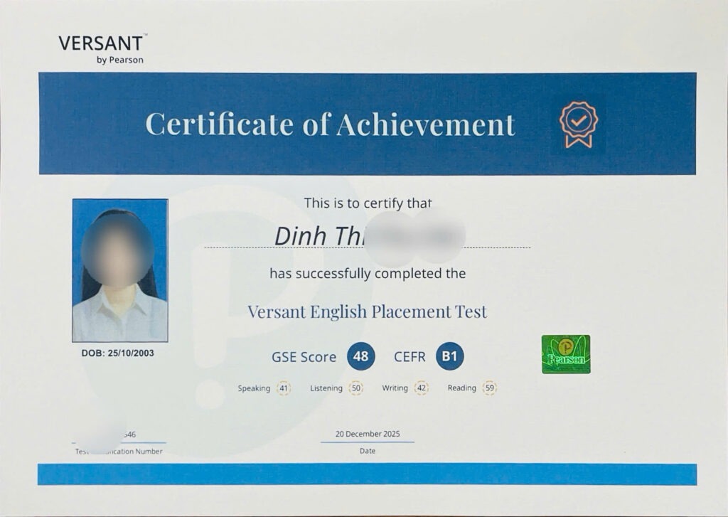 chứng chỉ Versant English Placement Test (VEPT) đã được công nhận và quy đổi tương đương các bậc của Khung năng lực ngoại ngữ 6 bậc dùng cho Việt Nam (KNLNNVN), áp dụng trong tuyển sinh và đào tạo trình độ đại học theo quy định hiện hành.